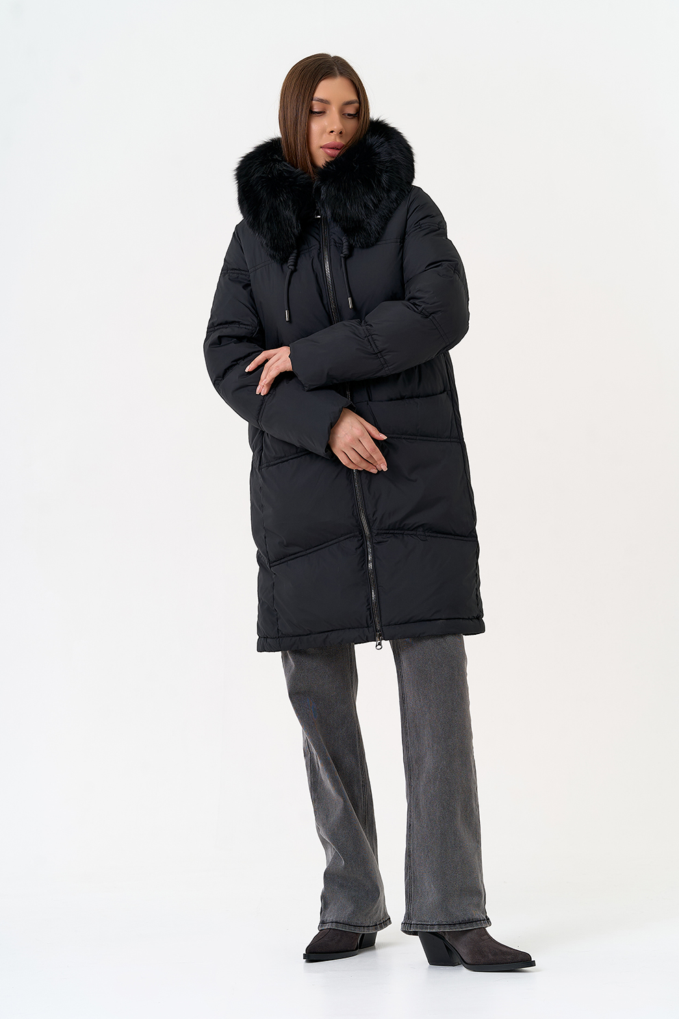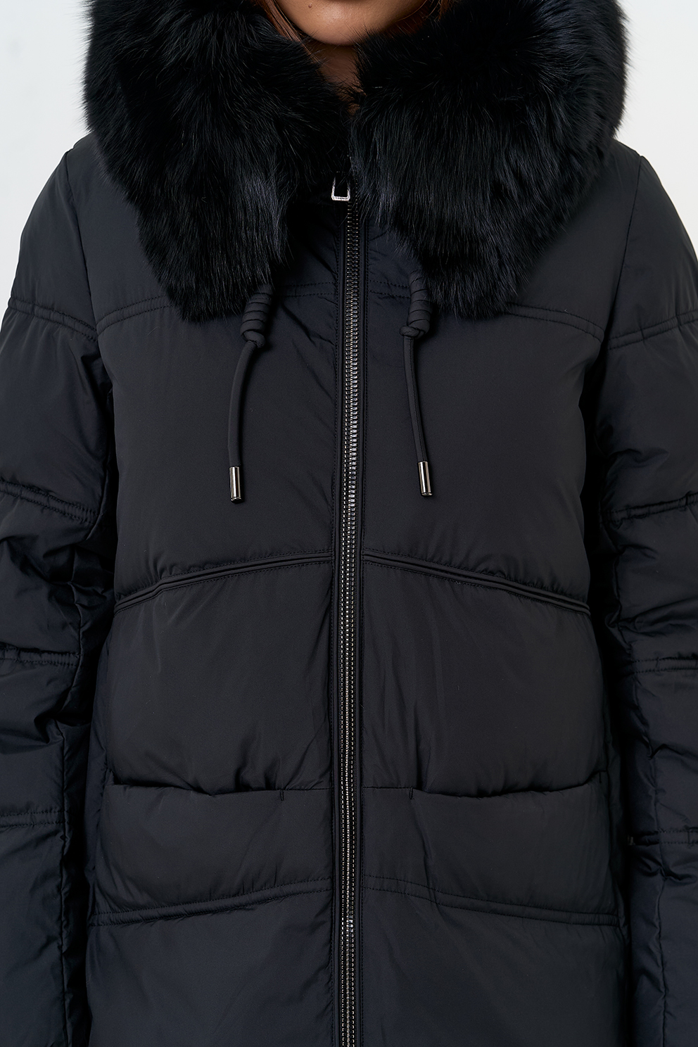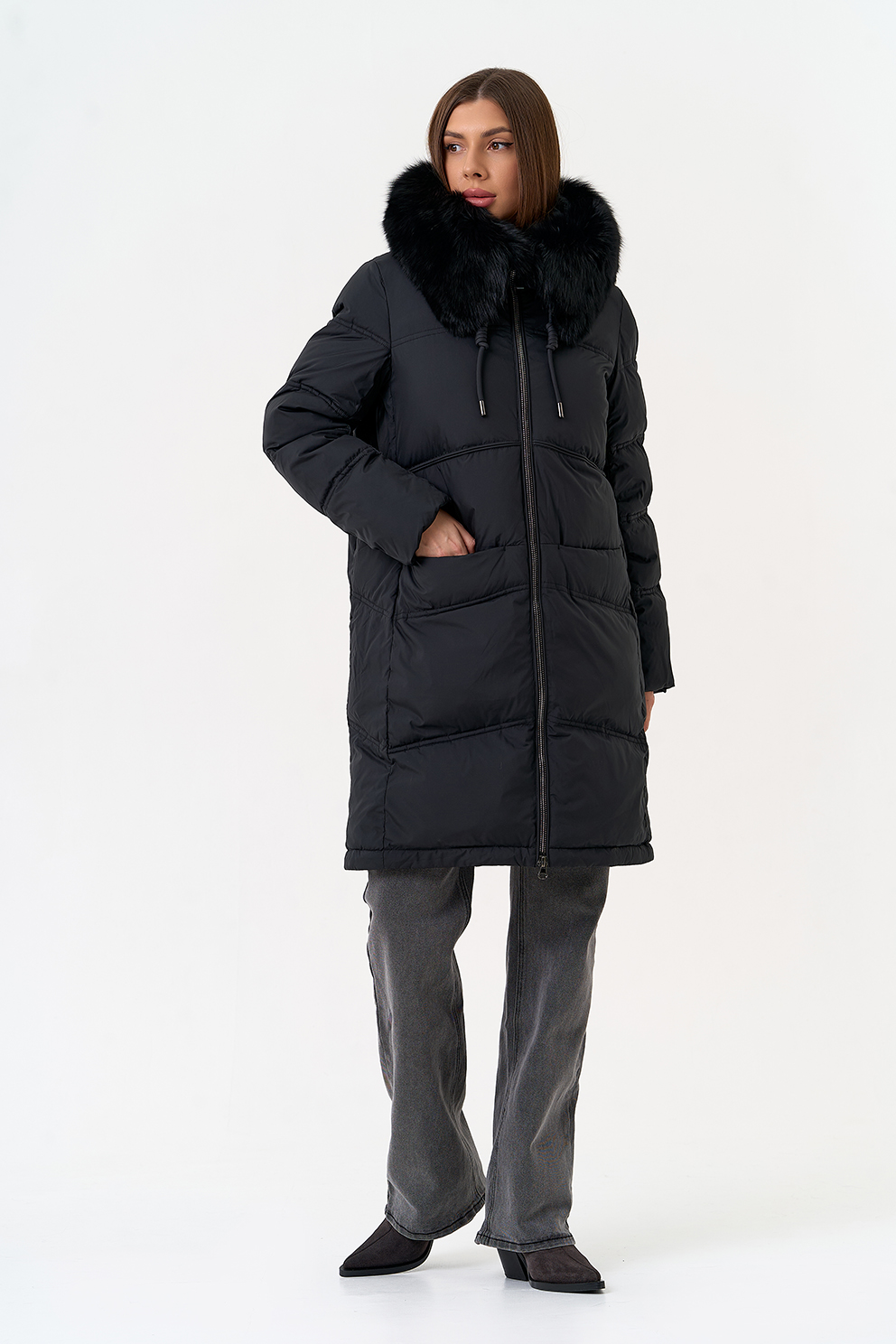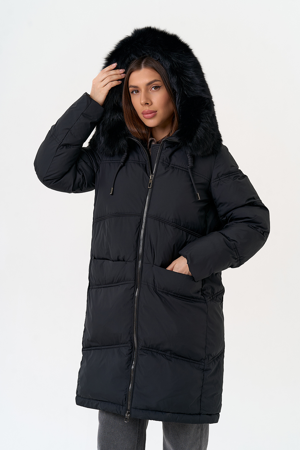 Крой воротника - капюшон, отделка песец