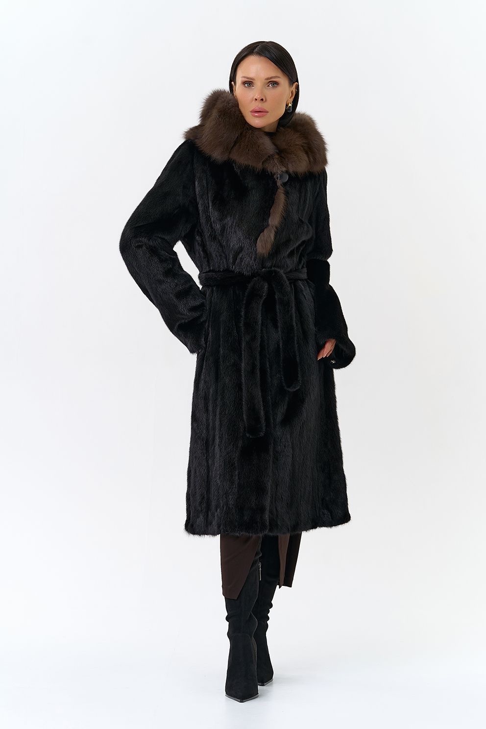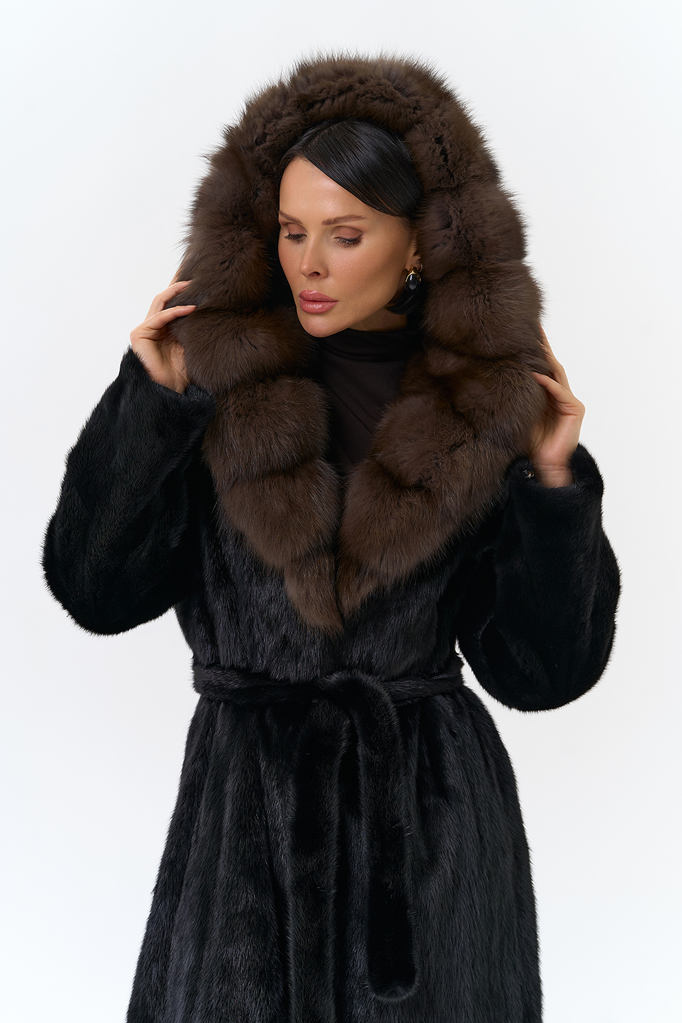 женщины. Капюшон выполнен с отделкой из куницы, что добавляет шубе роскоши.